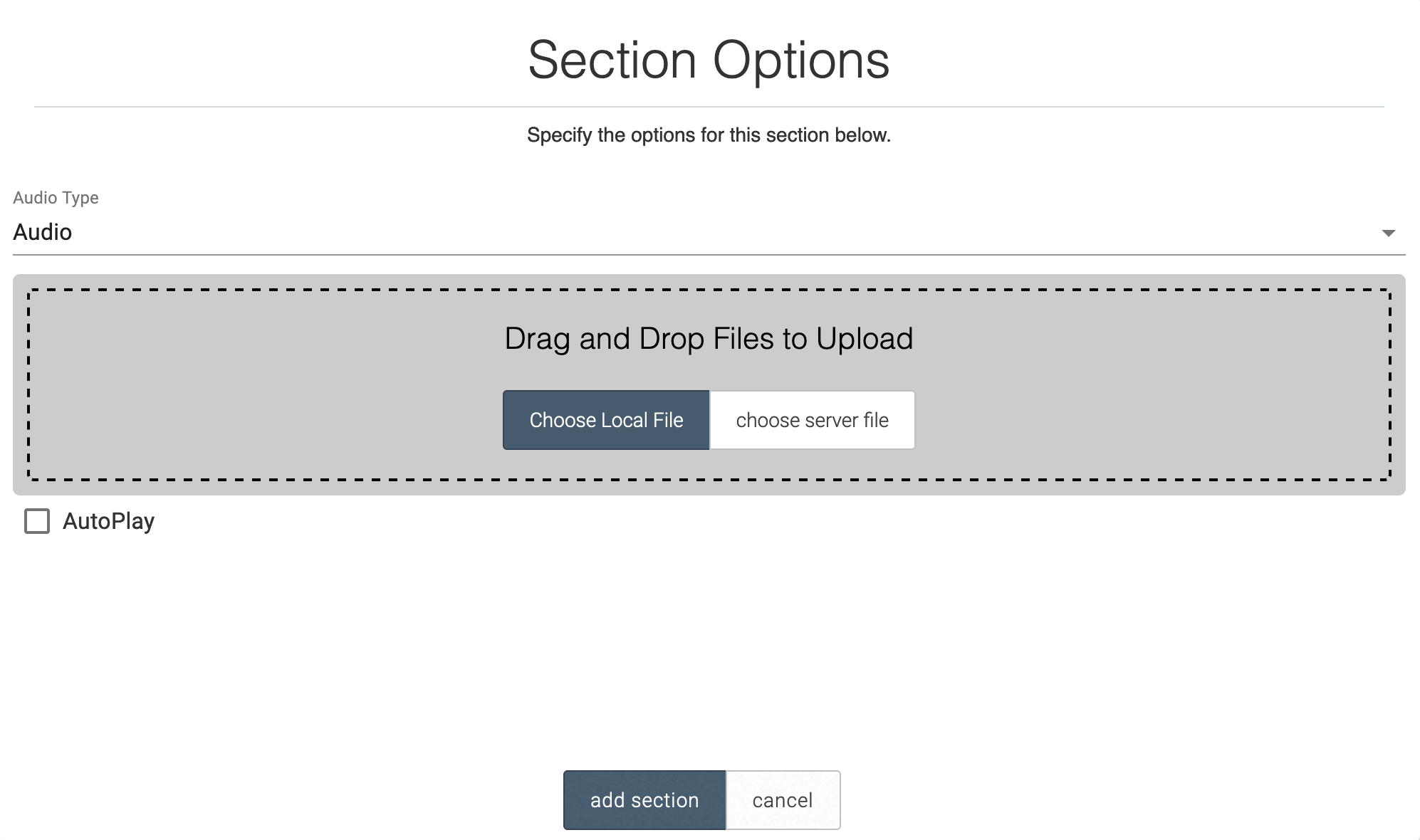 You can choose either a local file or a file that already exists on the website (i.e. a server file). There is also an option to select AutoPlay.
