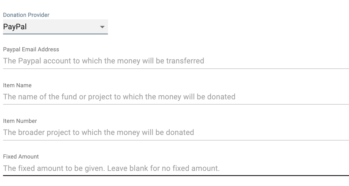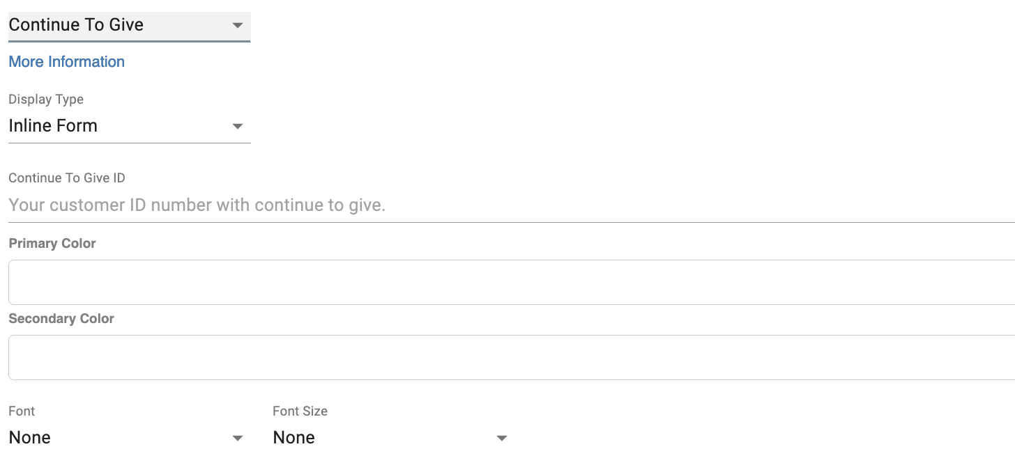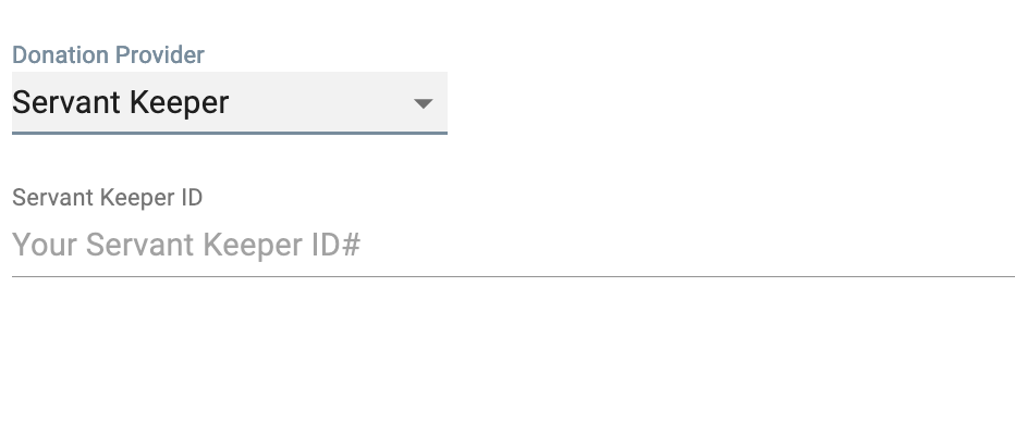 The giving options are Servant Keeper, PayPal, Continue to Give, Cornerstone. Each provider has different inputs required to properly connect to each giving provider.