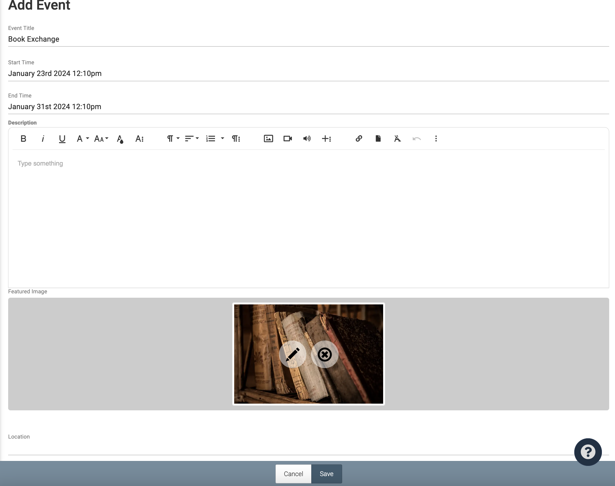 Here you can insert the Event Title, start and end time, a description of the event, an image, and a location.