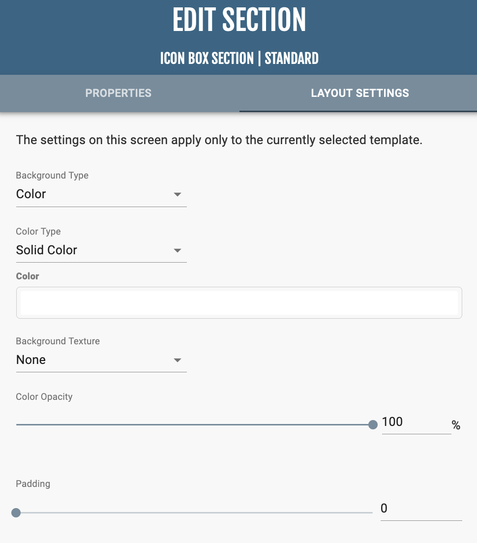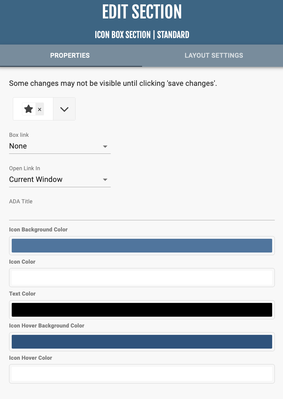 In “Section Properties,” you can manage where the icon box is linked to and the colors of the text, icon, and backgrounds.