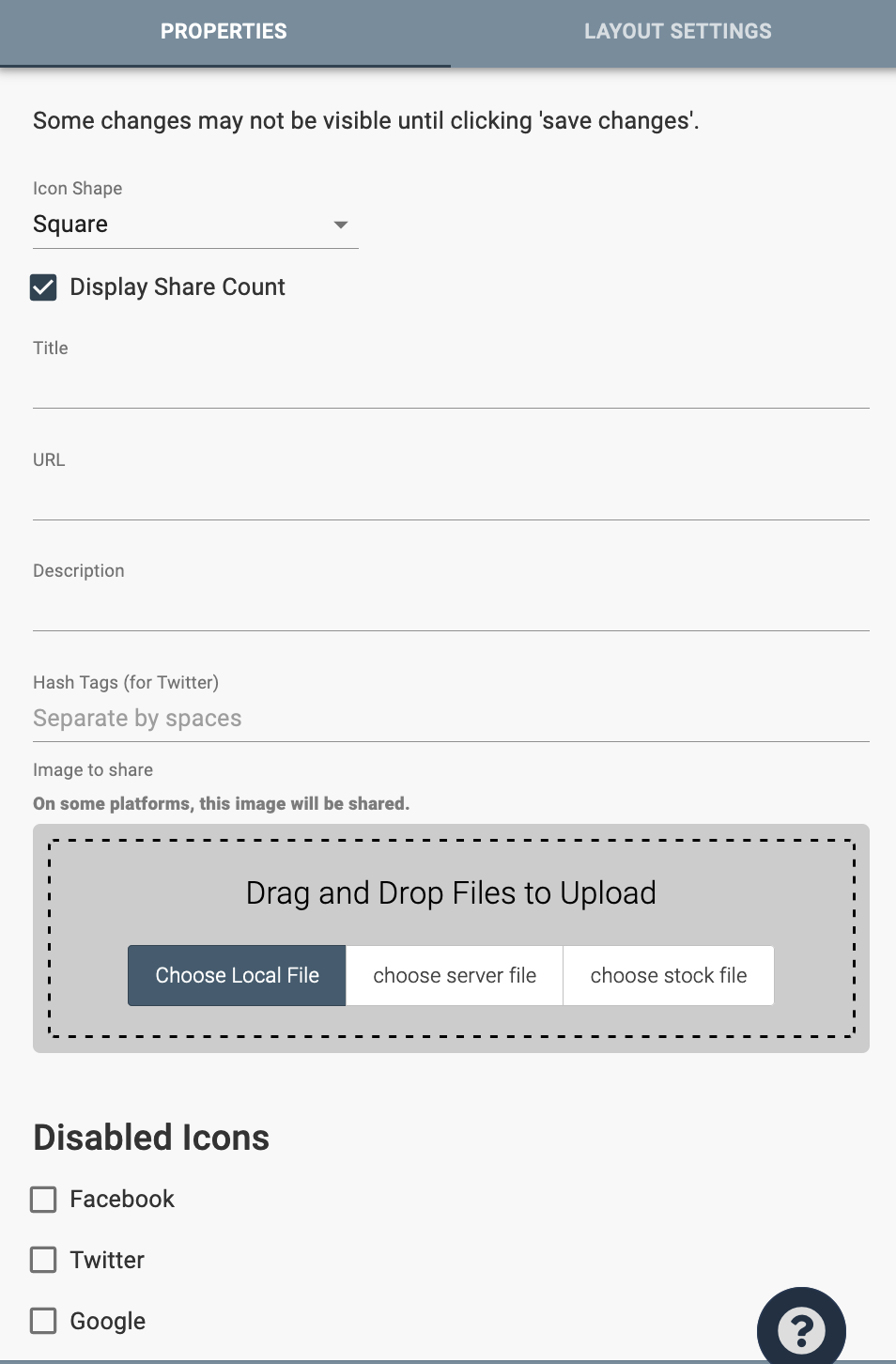After clicking “Section Properties,” you can add a Title, URL, description, and Hash Tags that will be sent to the selected social media platform to create the post. At the bottom of the Section Properties, you can disable unused social media icons.