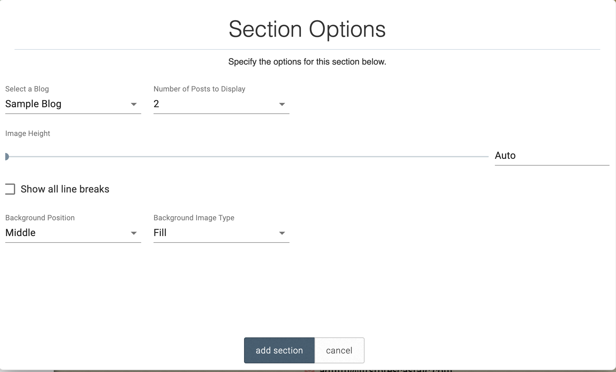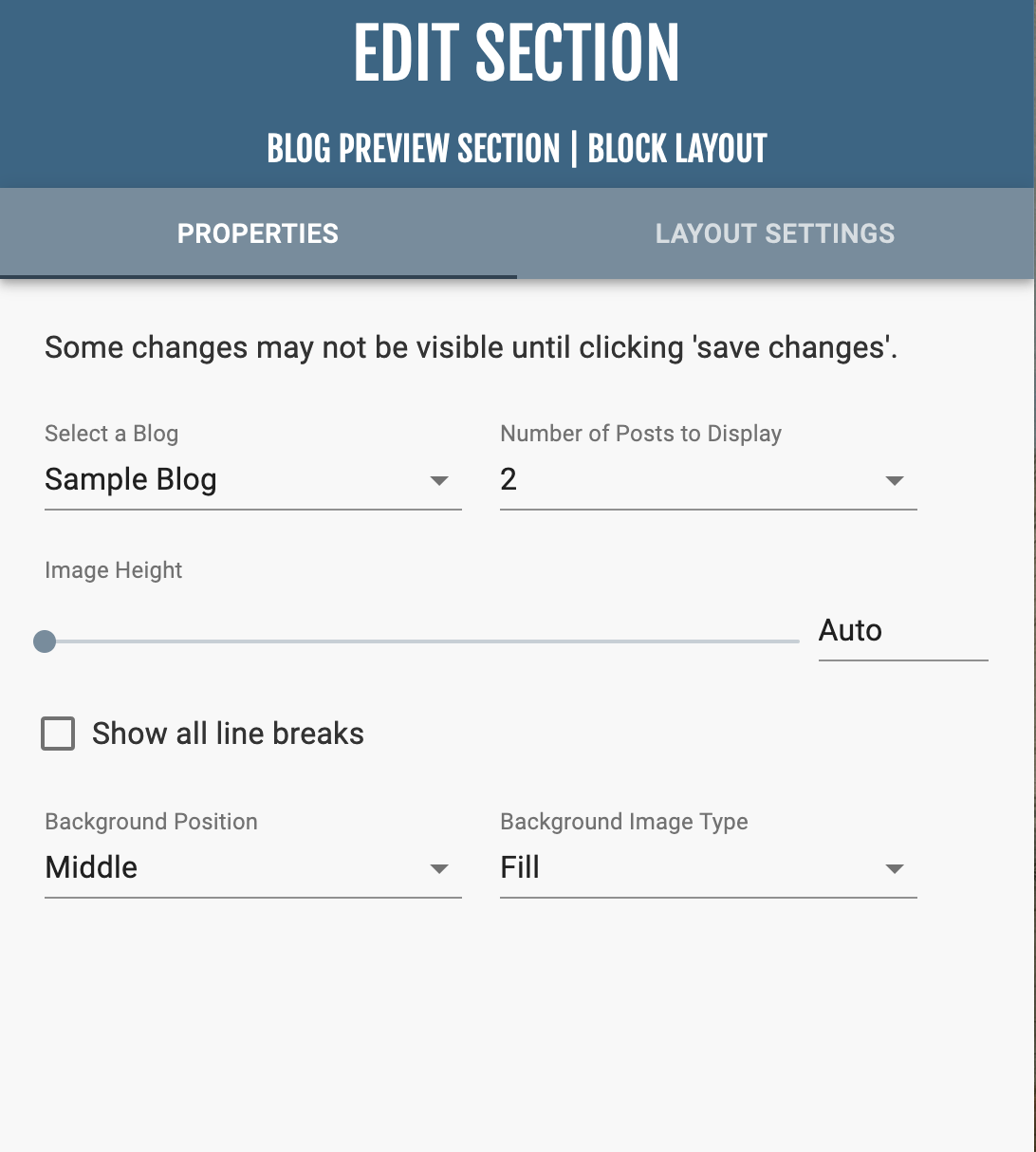 Click "Section Properties" to view the same options when adding the section. You can change which blog is displayed, how many posts are previewed, and background settings.