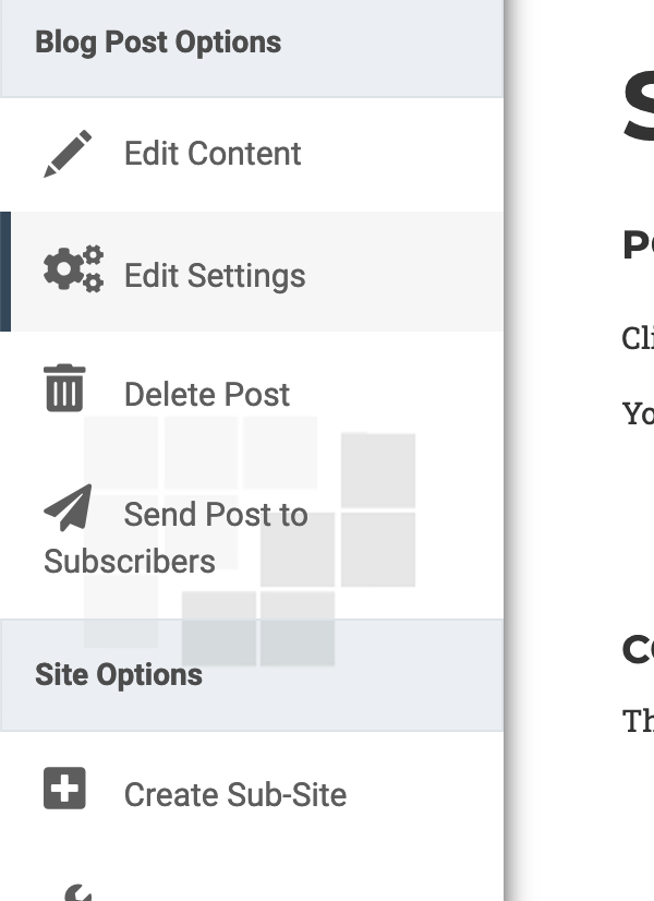 To manage settings such as post date’s, images, thumbnails, tags, comment allowance, or hiding the post, click “Edit Settings.”