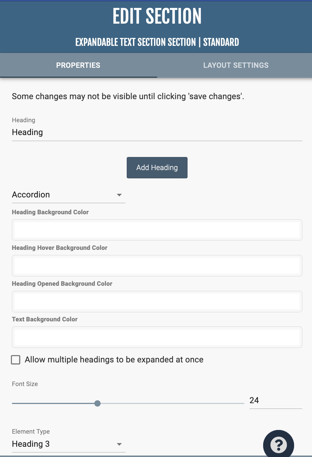 In “Section Properties,” you can rename, add, and arrange headings. When arranging headings, arrange the headings from left to right as you would like them to display top to bottom. Below the headings, there is a dropdown menu where you can choose from four different styles of headings: Accordion, Information, Basic, and Accordion Minimal. The controls for heading and text colors, font size, and paragraph style of the headings are found at the bottom of the page.