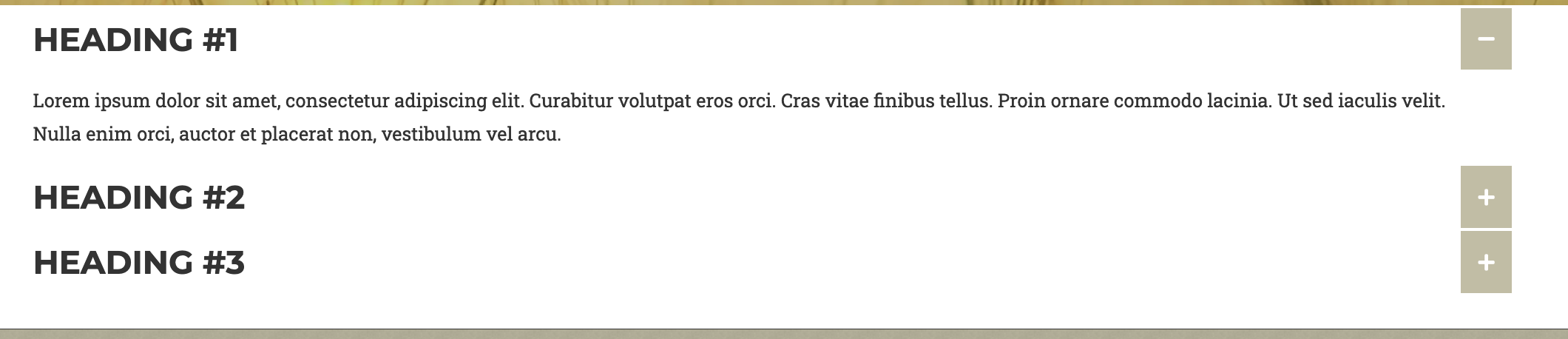 This section displays either a singular or multiple headings, that when clicked expand downward to display a text section.