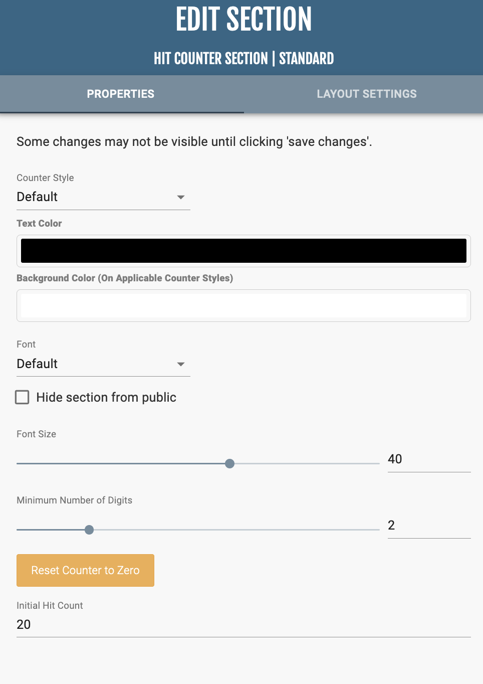 In “Section Properties,” you can edit the style of the counter (Default, Squares, Circles), the corresponding style colors, and font size. At the bottom of the menu, you can adjust the minimum number of digits, reset the counter, and set an initial count for the counter.