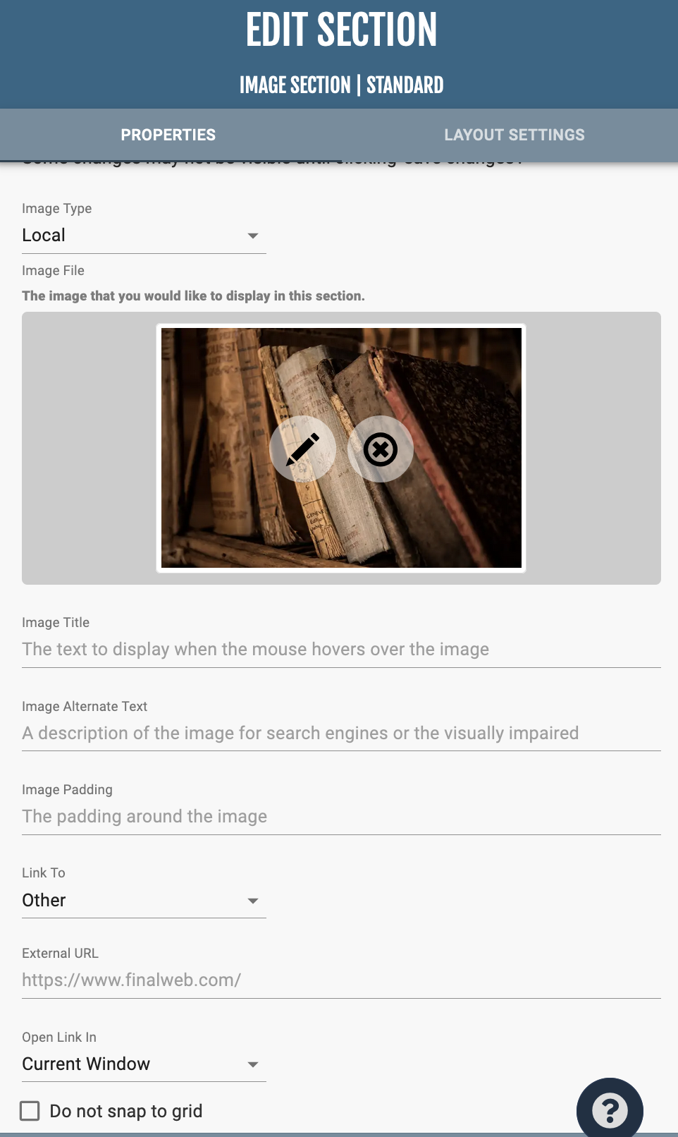 In the Sections Properties, you can add a hover image title, other text information, and link the image to an external URL. The checkbox “Do not snap to grid” allows greater flexibility in where you are able to arrange the image in a group. In the “Layout Settings,” you can apply a border and animations to the image.