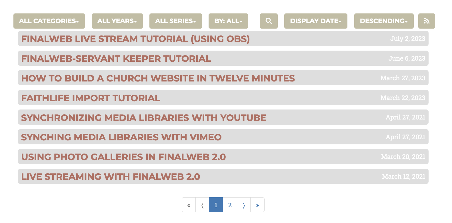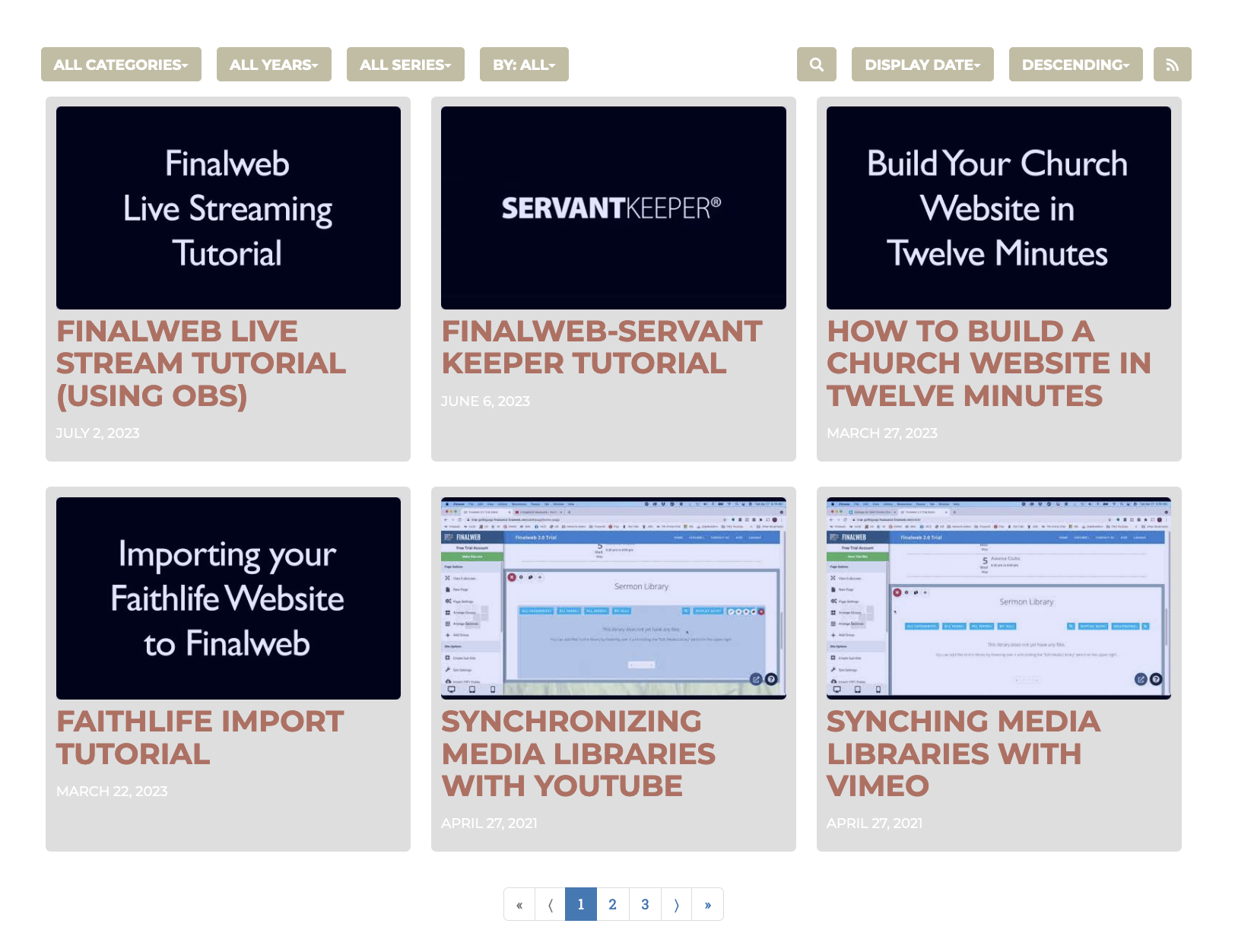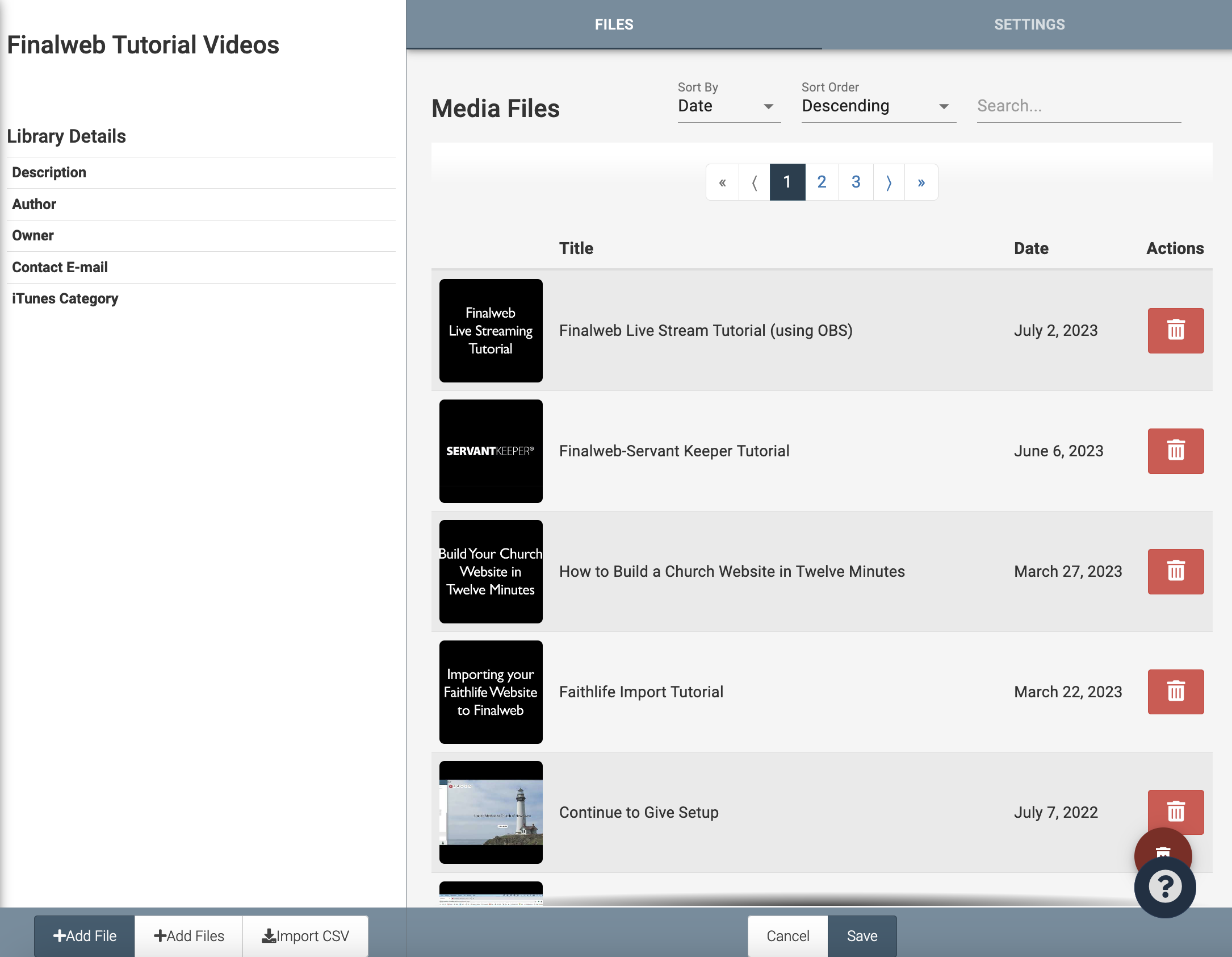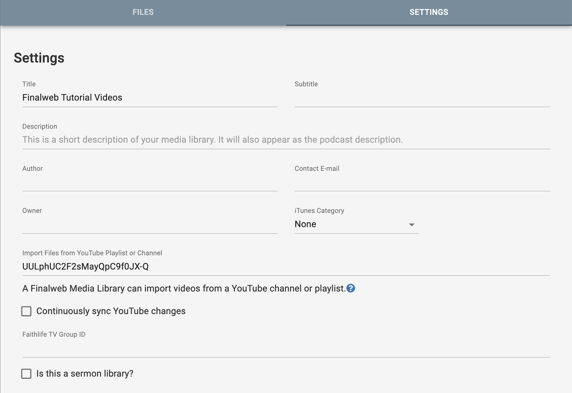 Returning to the Edit Media Library screen, there is a “Settings” tab at the upper right. Here you can manage information related to the library. It is here where you can sync an existing Media Library to another video or streaming provider, such as a YouTube channel or playlist, Faithlife TV, RSS Feed, Apple Podcast, and Google Podcasts. If you submit an RSS feed to Google or Apple, inserting the URLs makes it easier for users to access and subscribe to the particular podcast. The URL links displays the icons at the top of the Media Library.