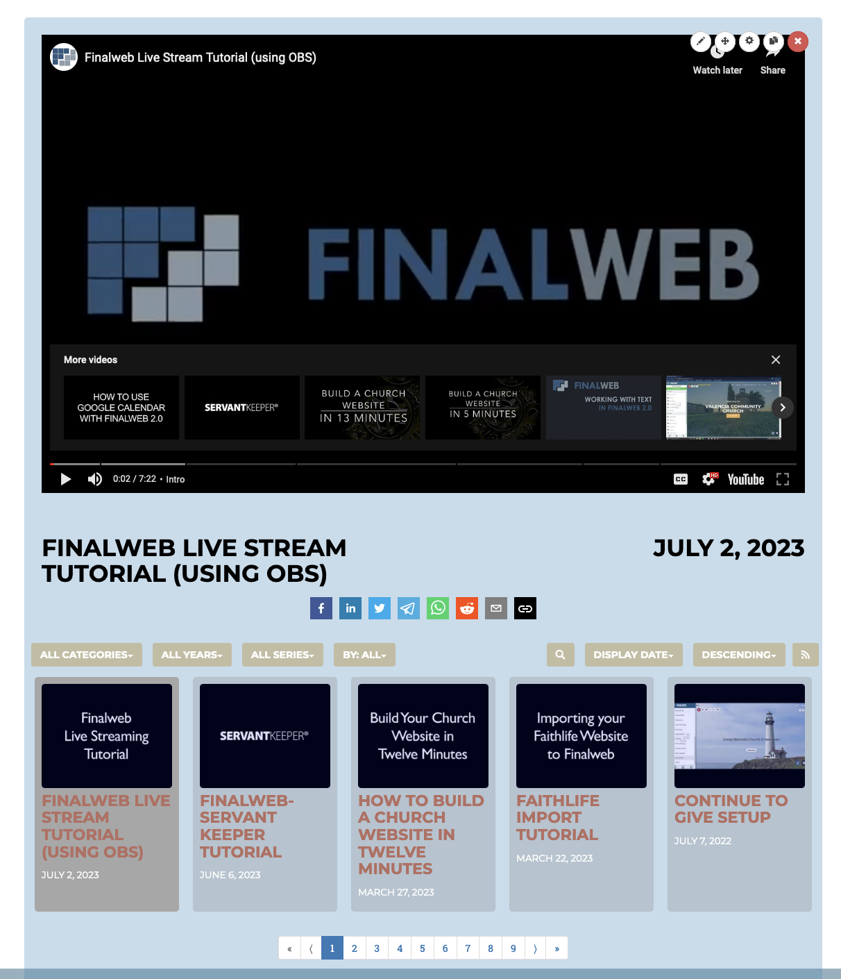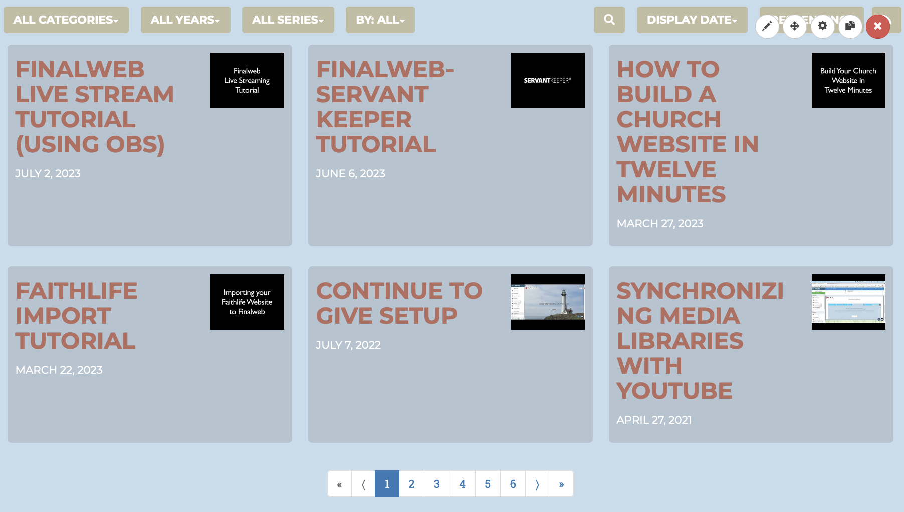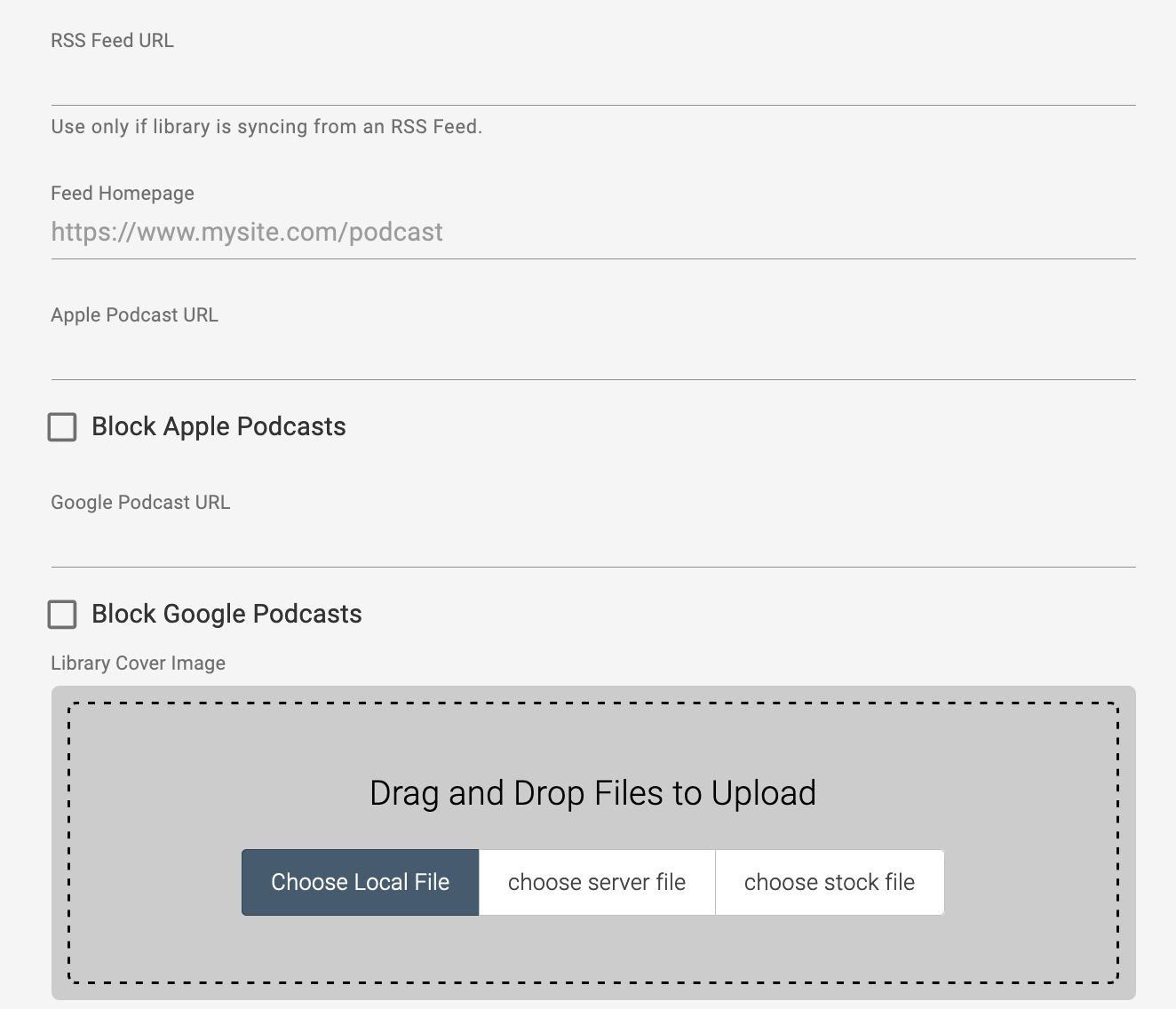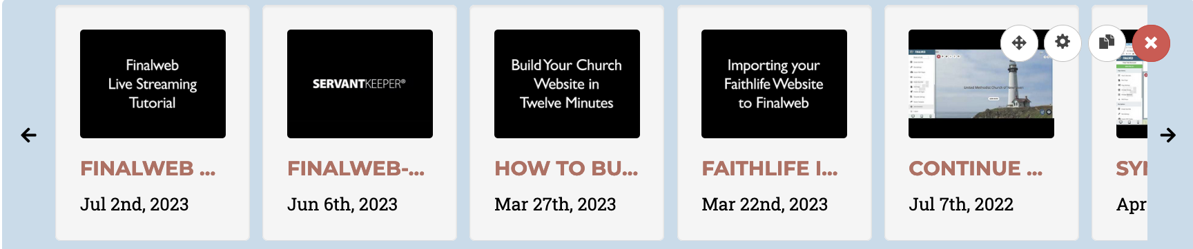 Returning to the Edit Media Library screen, there is a “Settings” tab at the upper right. Here you can manage information related to the library. It is here where you can sync an existing Media Library to another video or streaming provider, such as a YouTube channel or playlist, Faithlife TV, RSS Feed, Apple Podcast, and Google Podcasts. If you submit an RSS feed to Google or Apple, inserting the URLs makes it easier for users to access and subscribe to the particular podcast. The URL links displays the icons at the top of the Media Library.