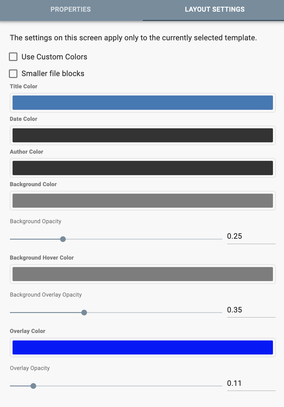 On the Layout Settings Tab, you can select ‘Custom Colors’ to use different colors than those provided from the Template Settings. There are custom title, date, author, background and background hover, and overlay colors.