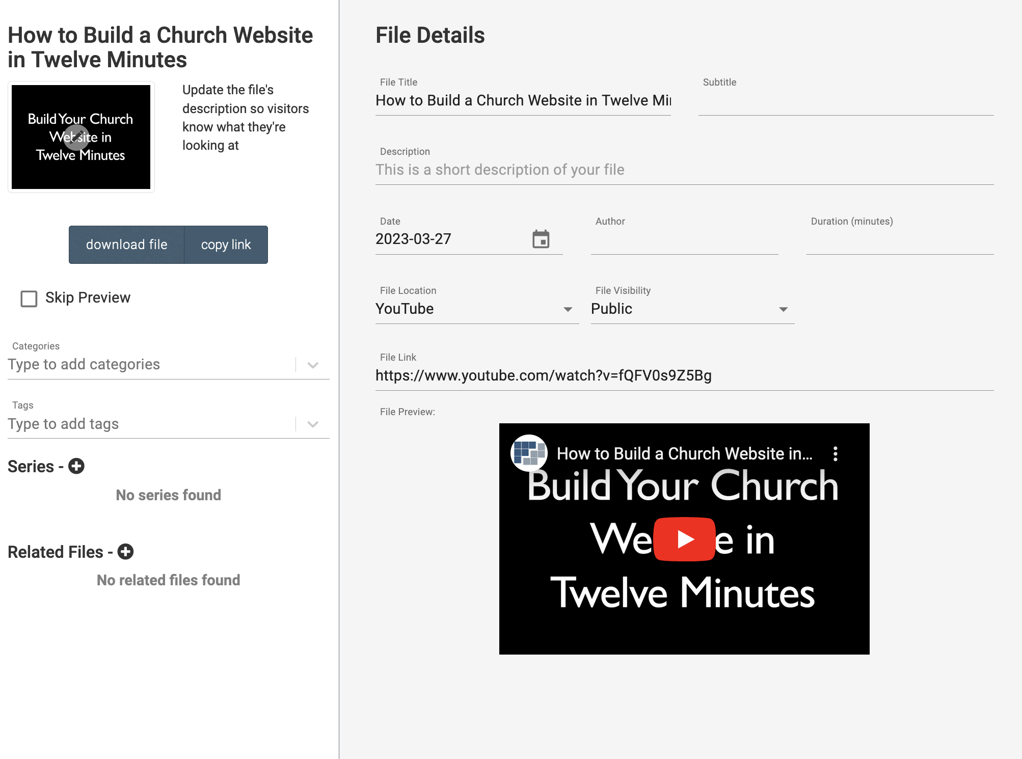 After adding a file, you will be directed to the File Editor. You can reach the File Editor by clicking on a file in the Edit Media Library Menu. On the left side of the screen, you can manage categories, tags, and series that the file can be searched by. As well, you can here download the file or get a shareable link for others to download the file. On the right side of the screen, you can manage, the File title, subtitle, description, date, author, file visibility, and other information about the file. Make sure you click save after editing a file!