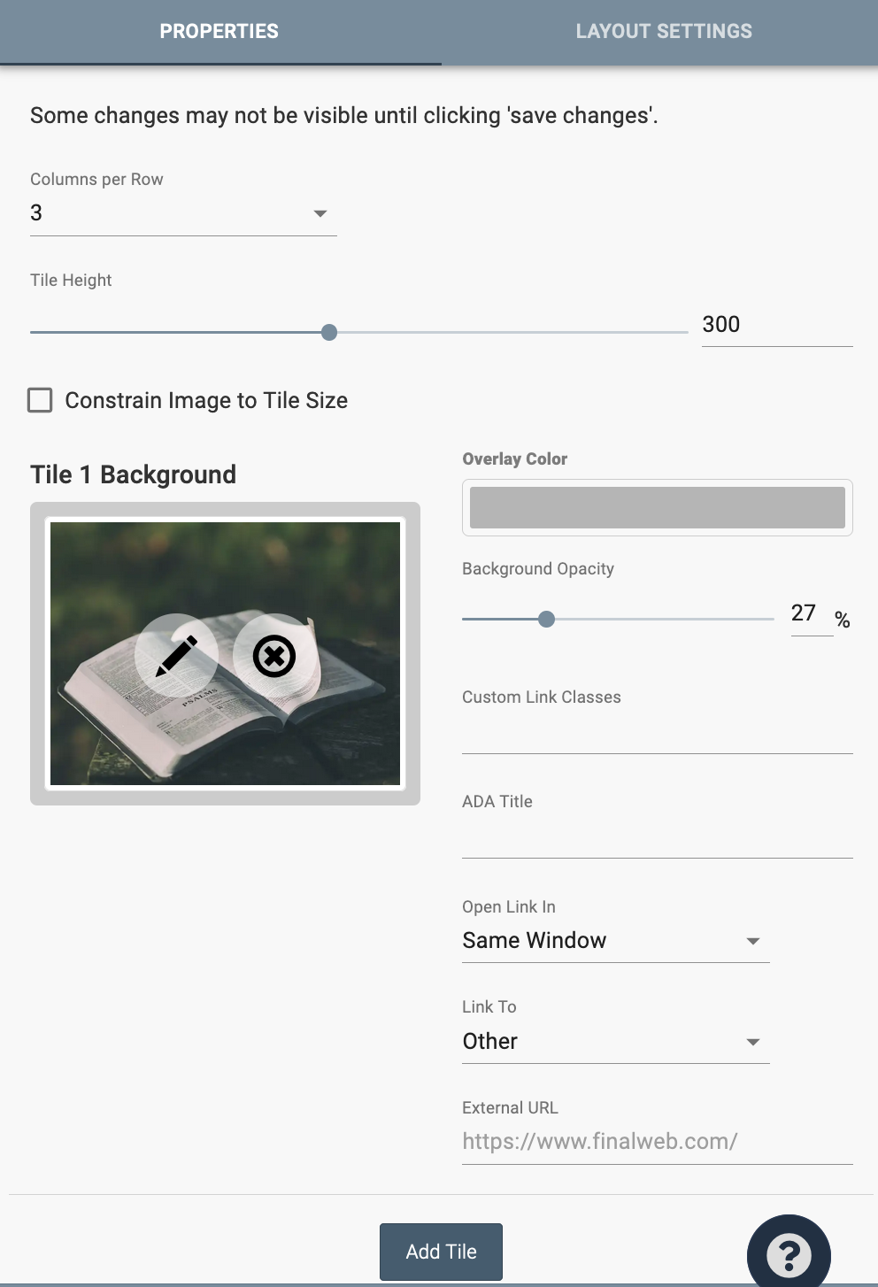 There are a variety of settings for each tile, including the image, overlay color, and where the tile links to. The ADA Title is a title for the image so that people with sight disabilities can know what the image is.